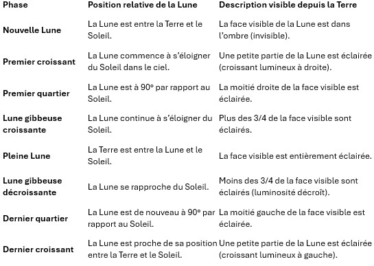 L’aspect visible de la Lune change en fonction de sa position relative par rapport à la Terre et au Soleil. Cela est dû à l’illumination de la Lune par le Soleil et à notre point de vue terrestre. Voici les différentes phases de la Lune au cours d’une lunaison :